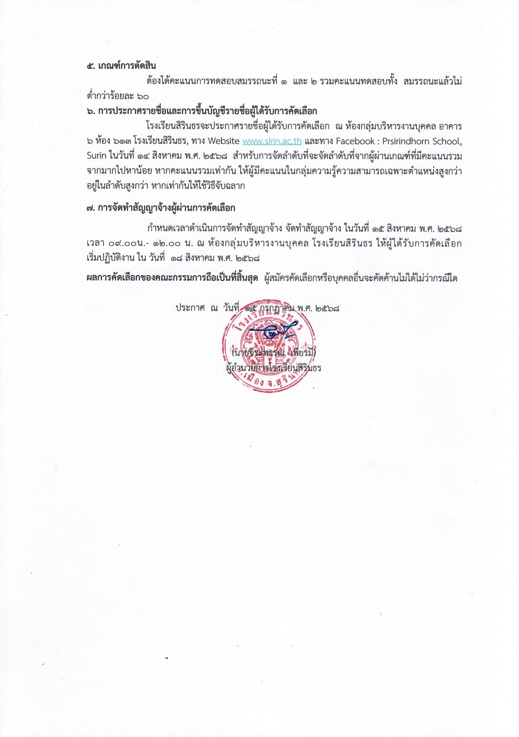 ประกาศโรงเรียนสิรินธร เรื่องประกาศผลผู้ผ่านการสอบคัดเลือกเป็นลูกจ้างชั่วคราวรายเดือน ตำแหน่ง ครูอัตราจ้าง (เอกคหกรรมศาสตร์)