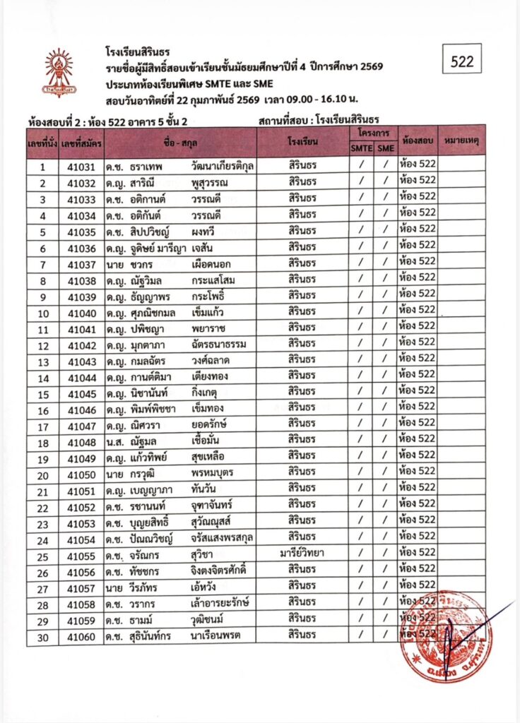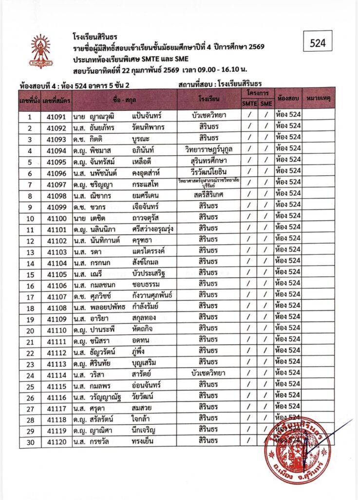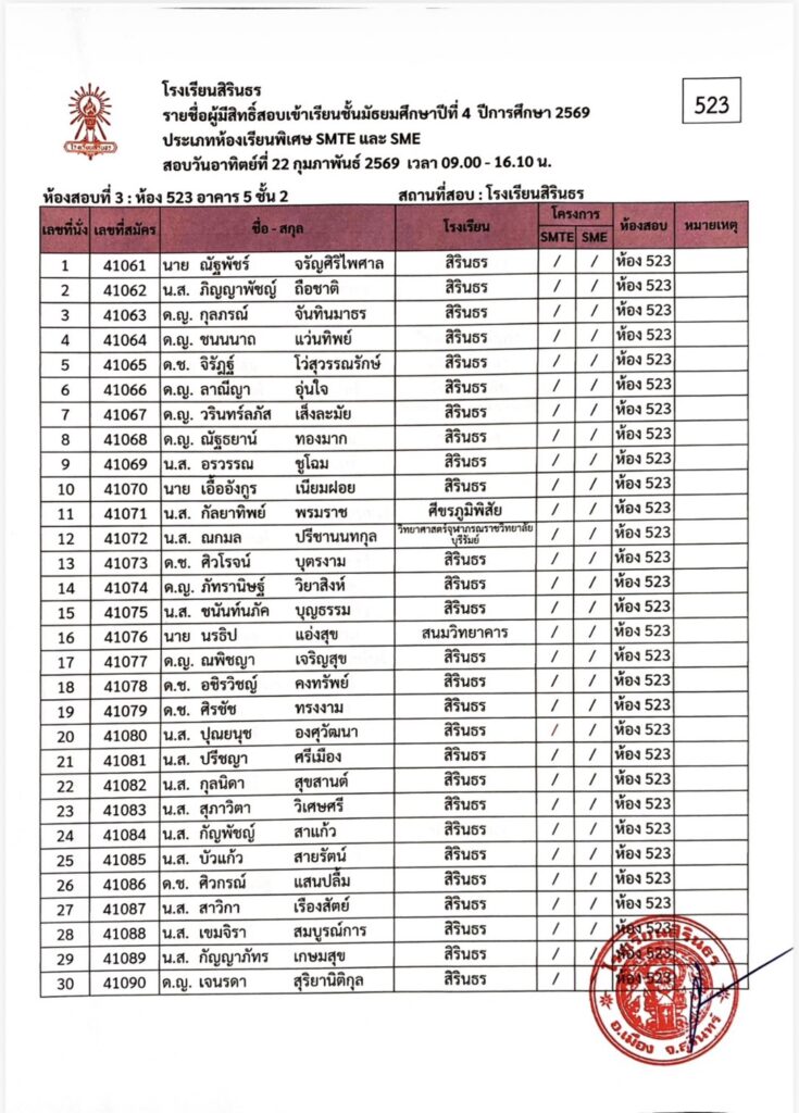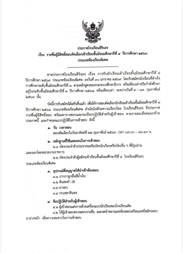 เรื่อง ประกาศรายชื่อผู้มีสิทธิ์สอบคัดเลือกเข้าเรียนชั้นมัธยมศึกษาปีที่ 4 ปีการศึกษา 2569