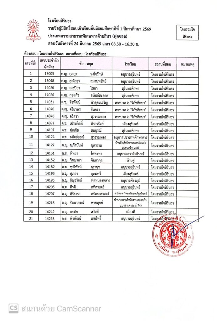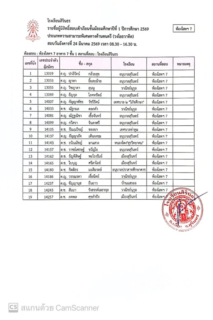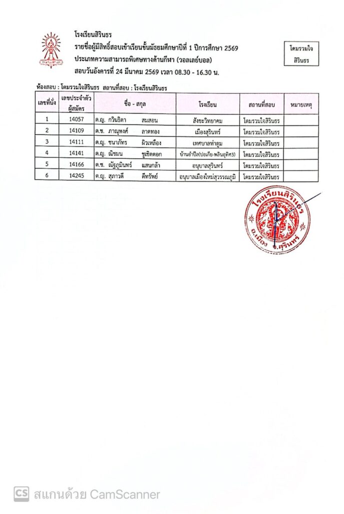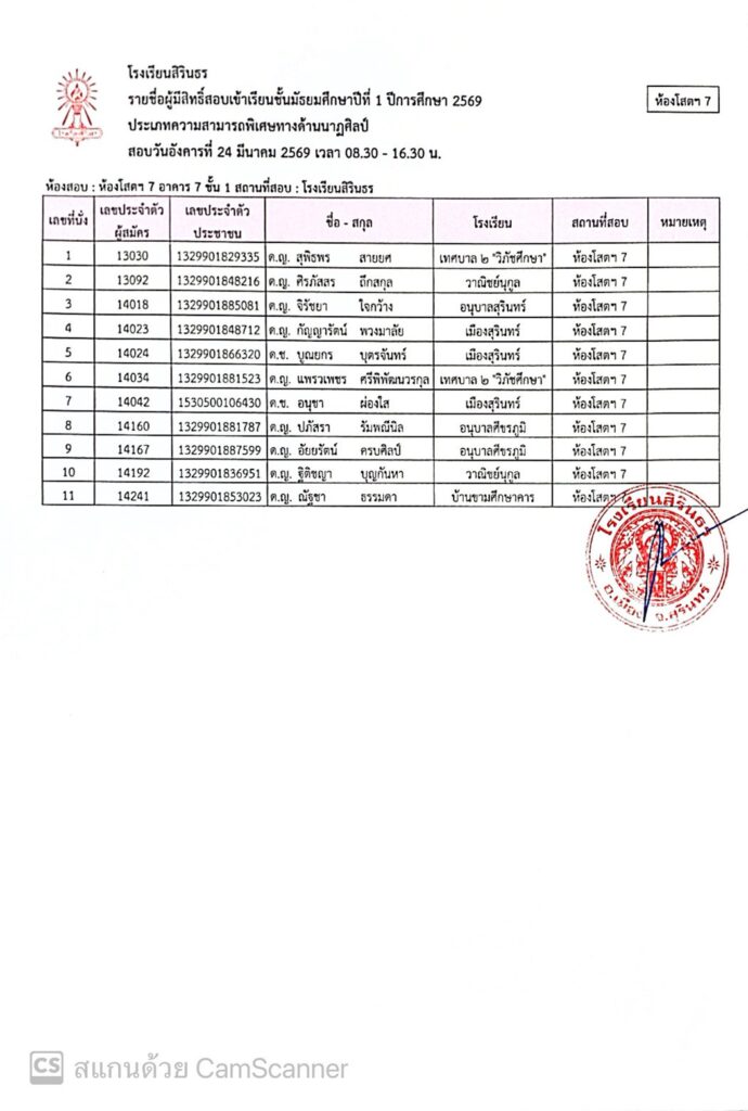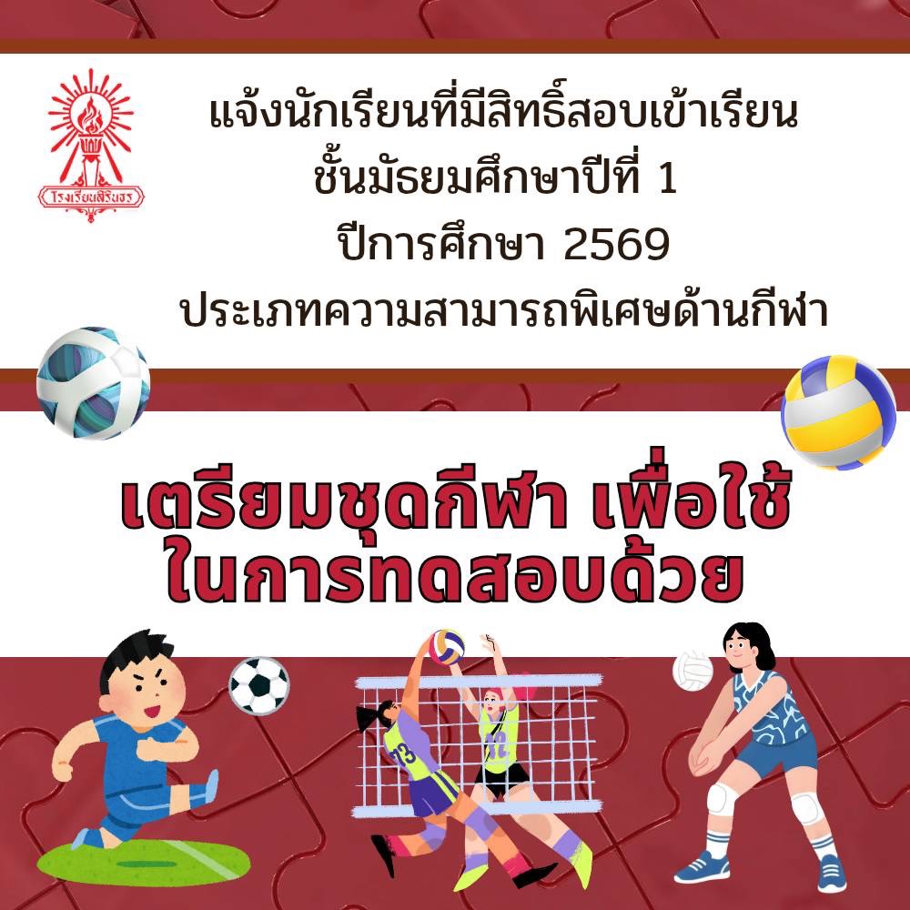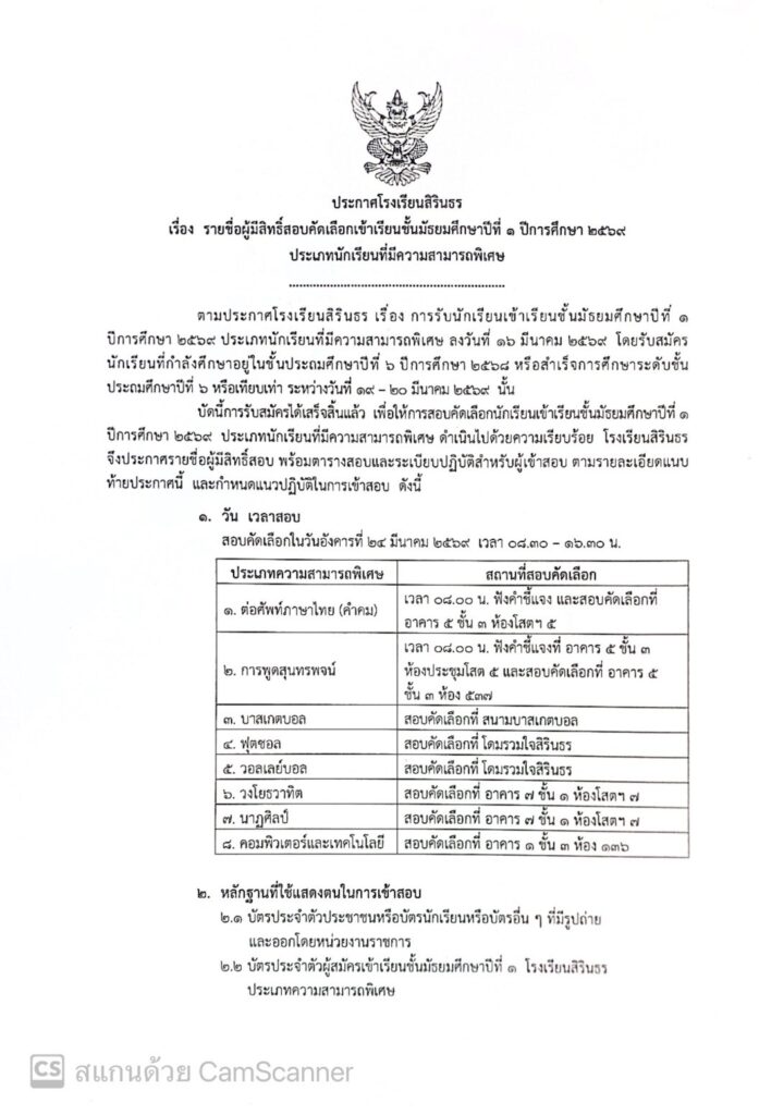 ประกาศรายชื่อผู้มีสิทธิ์สอบเข้าเรียนชั้นมัธยมศึกษาปีที่ 1 ปีการศึกษา 2569 ประเภทนักเรียนที่มีความสามารถพิเศษ