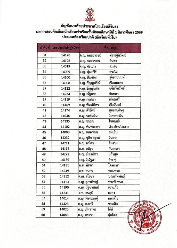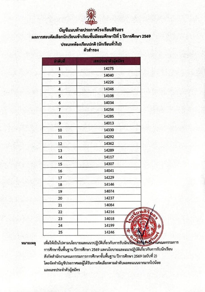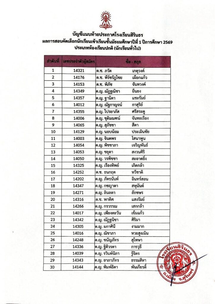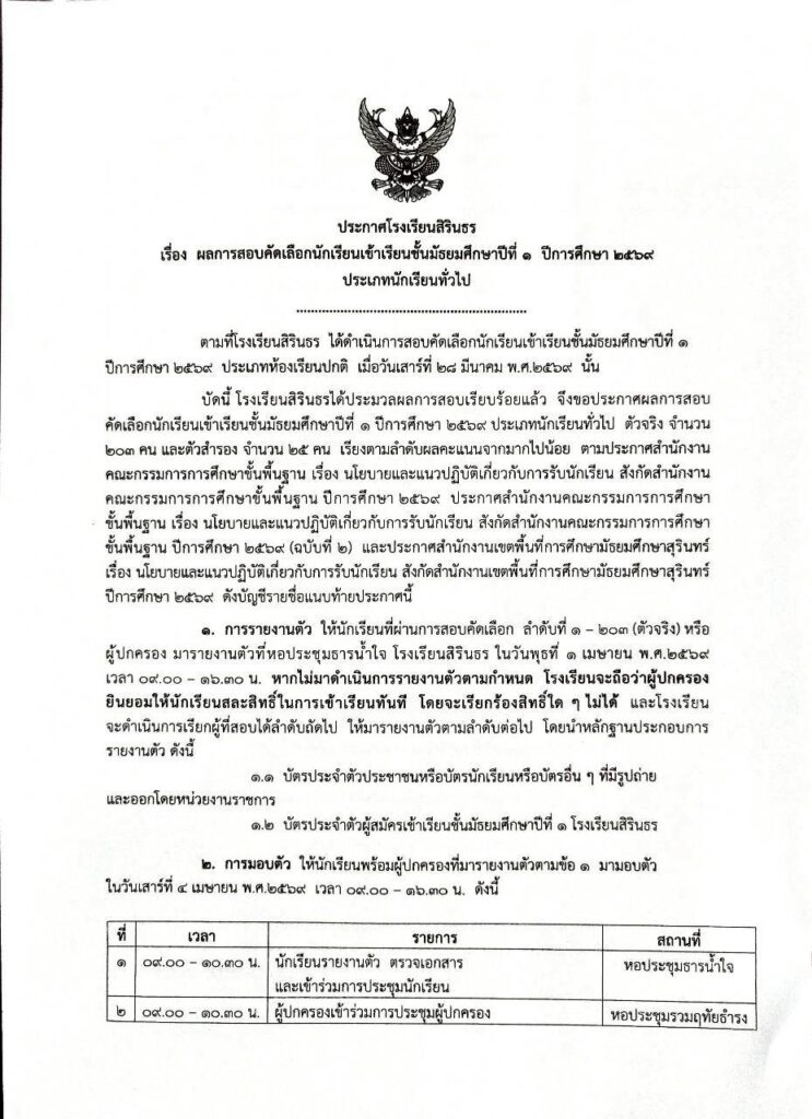ประกาศผลการสอบคัดเลือกชั้นม.1 ปีการศึกษา 2569 ประเภทนักเรียนทั่วไป