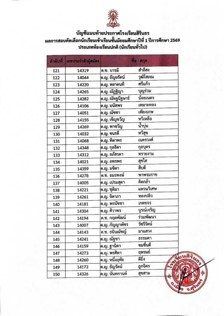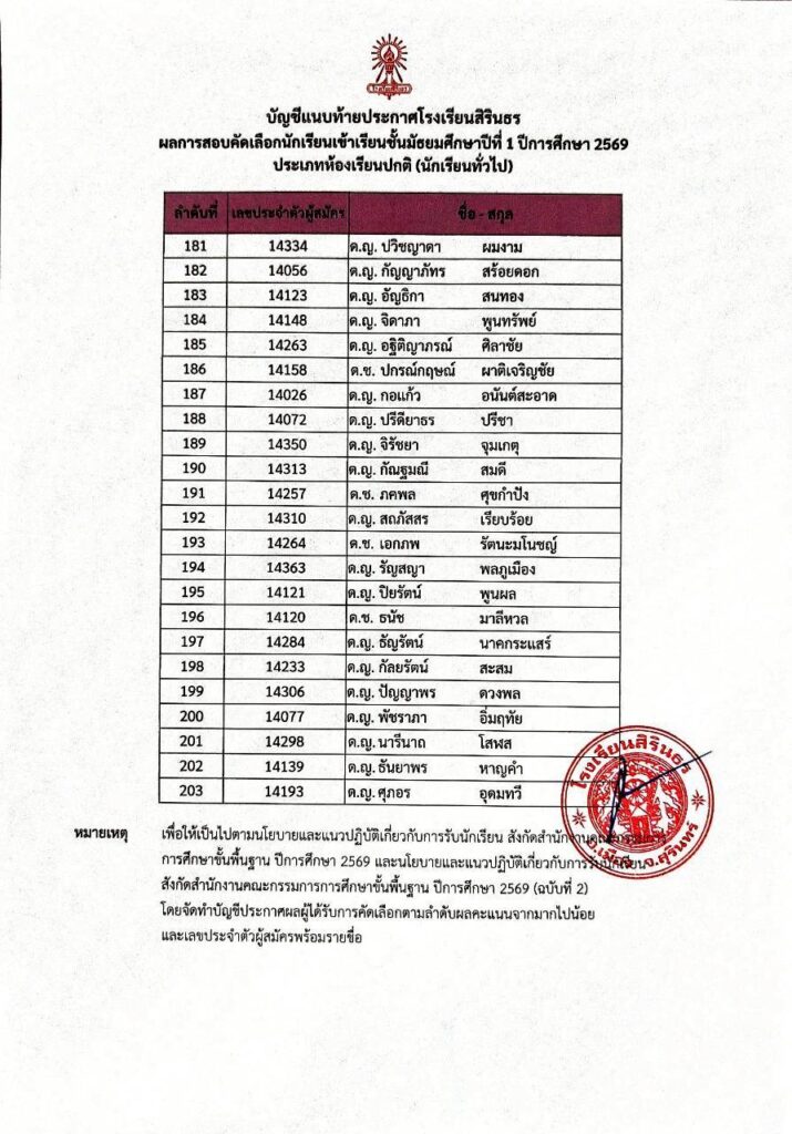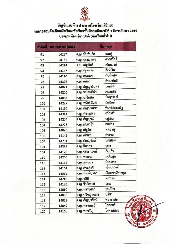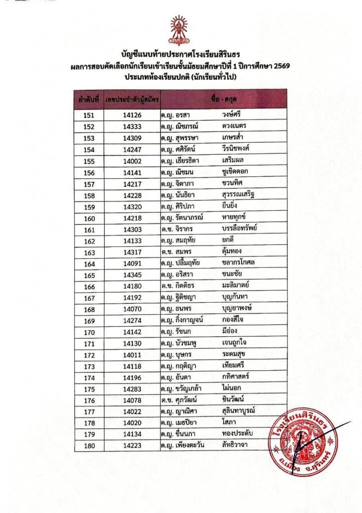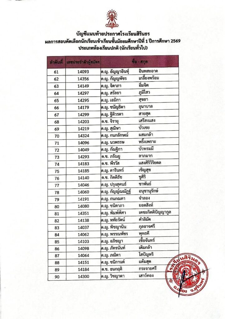 ประกาศผลการสอบคัดเลือกชั้นม.1 ปีการศึกษา 2569 ประเภทนักเรียนทั่วไป